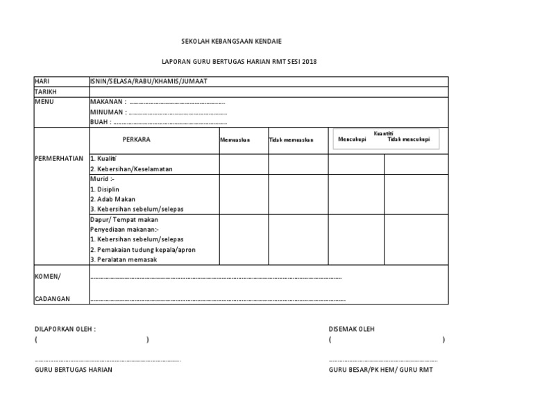 Laporan Guru Bertugas Rmt Harian 2017 Pdf